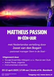 De Bavokerk wil dit prachtige verhaal, samen met de muziek van Bach, op zondagmiddag 29 maart graag delen met iedereen die het maar wil horen. Net zoals Bach het heeft bedoeld! En daarom staan de deuren van de kerk open voor iedereen, ook voor mensen voor wie ‘drie-uur-stilzitten’ of het kopen van een concertkaartje een drempel is om de Mattheus Passion mee te kunnen beleven.