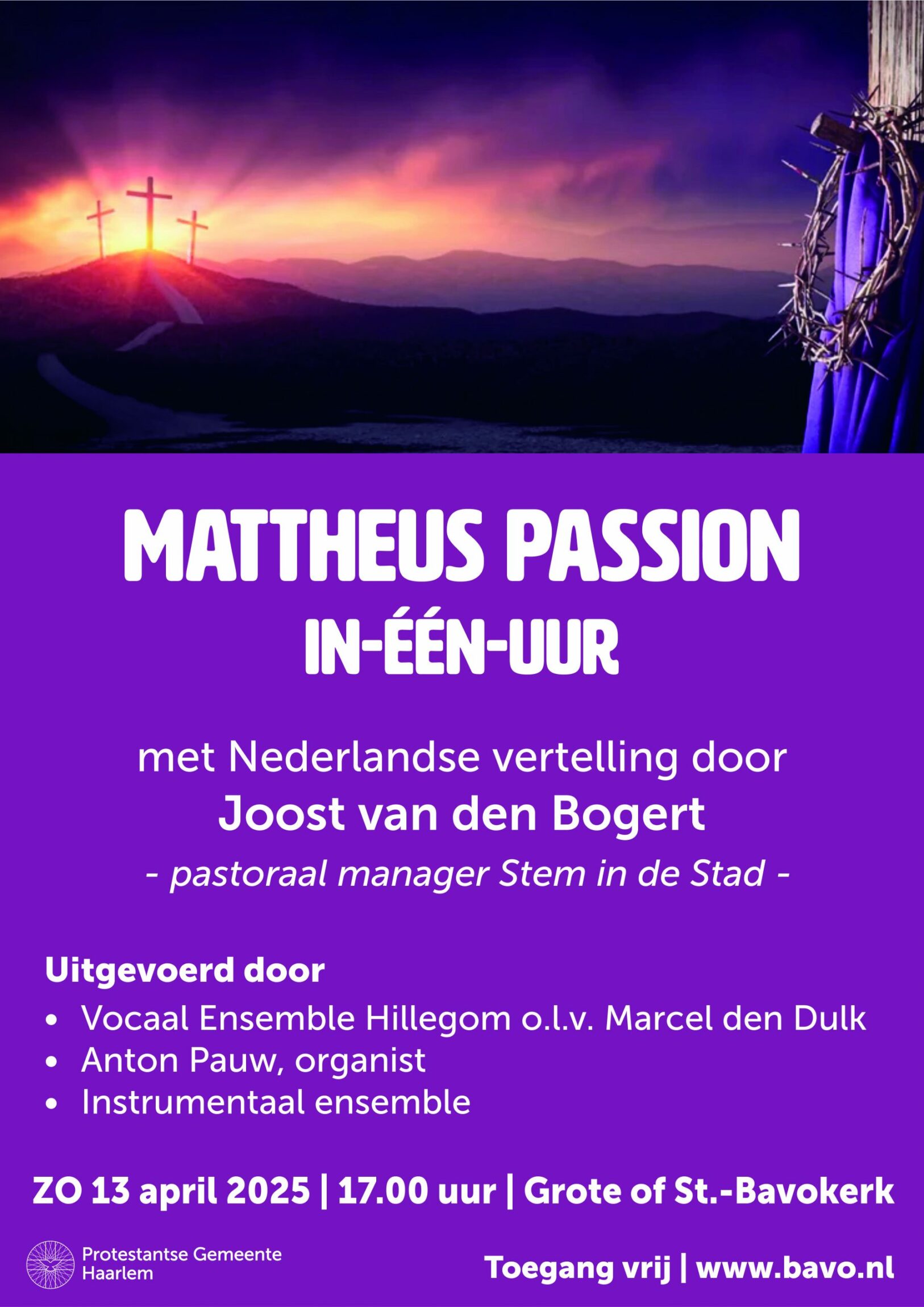 Een aantrekkelijke en toegankelijke uitvoering van het complete koorwerk van de Mattheus Passion van Bach met de mooiste aria’s en daarbij de Nederlandse vertelling door Joost van den Bogert (pastoraal manager van Stem in de Stad). En dat in vijf kwartier!