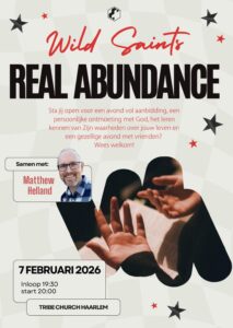 Zaterdagavond 7 februari is er weer een Wild Saints Real Abundance night! Dit keer is Matthew Helland de spreker! Matthew is iemand die veel uitstapt in profetie en het spreken van Gods woorden over je bestemming. Gods woorden bemoedigen en veranderen je! Zij geven je leven en kracht (Hebreeën 4:12). Het belooft dus een mooie avond te worden.