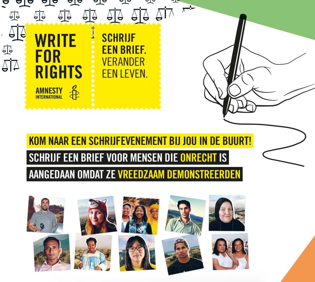 Rond de internationale Dag van de Mensenrechten (10 december) schrijven mensen over de hele wereld samen brieven voor negen verschillende mensen of groepen. Wereldwijd worden er zo miljoenen brieven tegen onrecht geschreven. Brieven voor mensen die onterecht vastzitten, of bedreigd en gemarteld worden omdat ze opkomen voor hun rechten. Een stem geven aan hen die monddood zijn gemaakt.